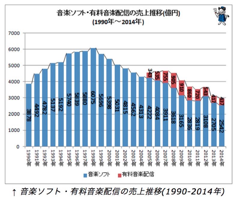 到了 AKB48 筹备出道的本世纪初,网络作为新媒体迅速崛起,其影响力日渐盖过以电视为代表的传统媒体。而日本唱片业的销售额,也受到网络下载的冲击,从 1998 年巅峰时期的 6000 亿日元(按当前汇率约折合人民币 370 亿元)持续下跌,到 2016 年已不足 3000 亿日元。