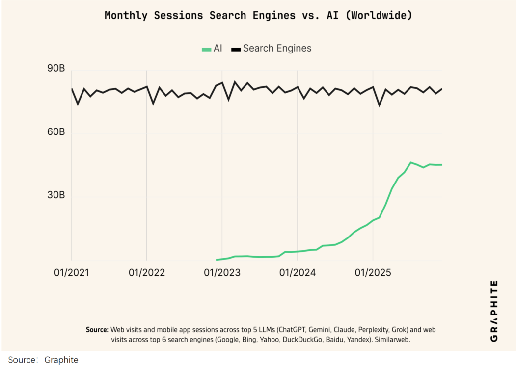 一份最新研究,对比了TOP5生成式AI与TOP6搜索引擎,发现AI访问量已达到全球搜索规模的56%。在60岁老头都会用AI的国内,人们甚至连搜八卦“吃瓜”都开始依赖AI。②