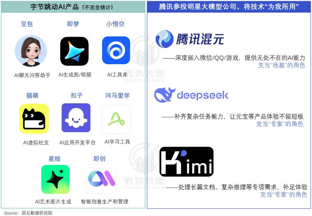 过去两年,字节“下饺子”般生产AI原生应用,涉及聊天、长文本生成、图片生成等C端高频场景,而腾讯元宝比豆包晚了一年上线;字节底层大模型追求“智能上限”,腾讯混元大模型能力较弱,陷入“自研大模型‘打地基’+投资和接入外部大模型”的路径依赖。