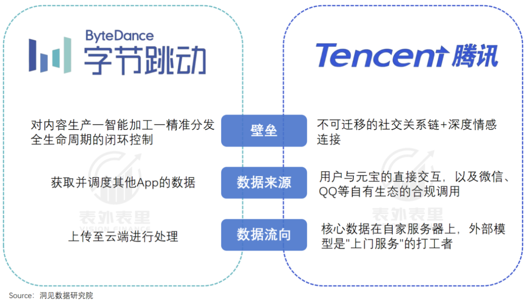 两家巨头都坐拥庞大数字资产,字节体量甚至更大,但高价值、高壁垒的数据可能称不上富足——短视频、直播电商,经验点在“情绪”与“消费”上;相比之下,社交、支付起家的腾讯,更能理解“对话”与“人的意图”,而后者才是AI从“感知”迈向“认知”的关键。