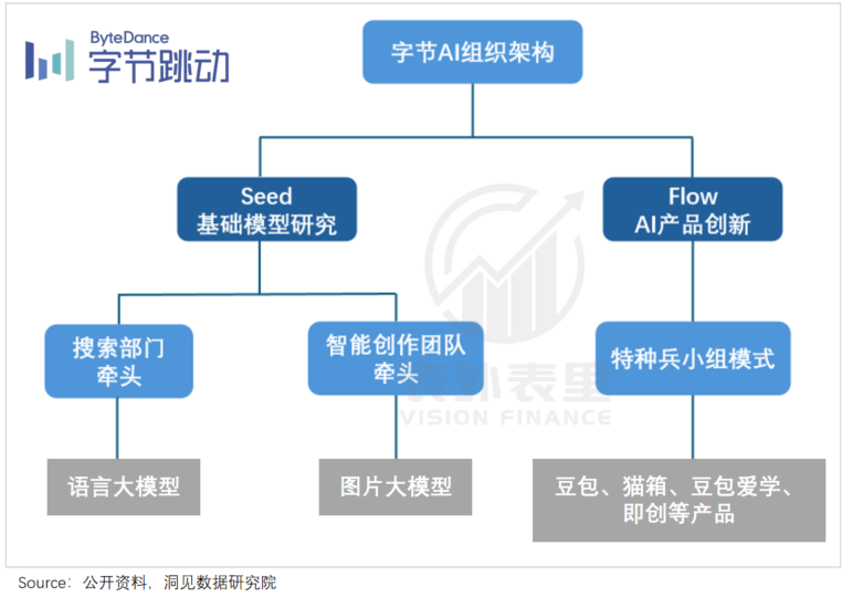 将AI视为下一代流量入口的字节,则选择“大力出奇迹”:Seed(基础模型研究)与Flow(AI产品创新)两大独立单元“研用分离”,且都与抖音平起平坐,同为“创始人工程”。