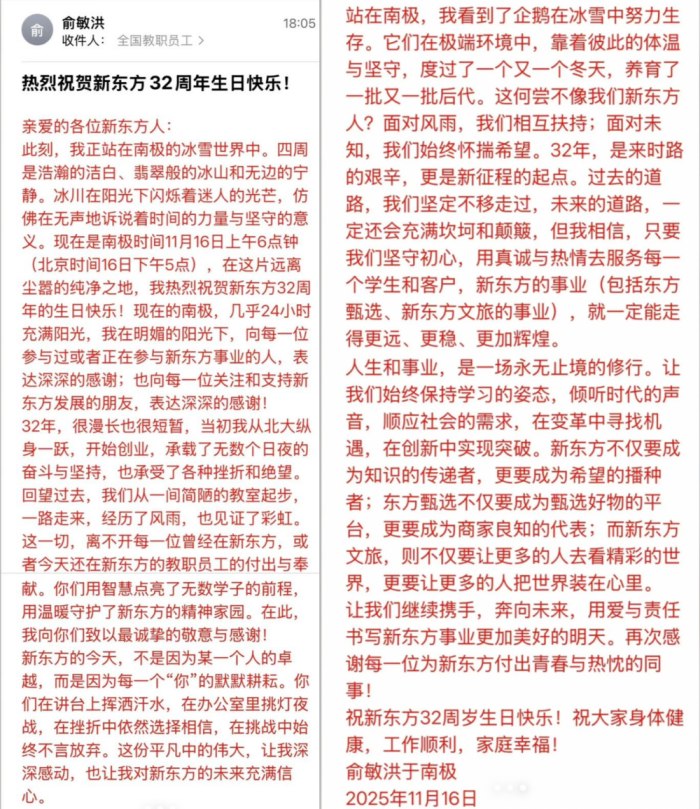 去年11月16日,新东方迎来32周年,俞敏洪身处南极向全体员工发出一封全员信。信中提到,“此刻,我正站在南极的冰雪世界中。四周是浩瀚的洁白、翡翠般的冰山和无边的宁静。冰川在阳光下闪烁着迷人的光芒,仿佛在无声地诉说着时间的力量与坚守的意义。现在是南极时间11月16日上午6点钟(北京时间16日下午5点),在这片远离尘嚣的纯净之地,我热烈祝贺新东方32周年的生日快乐!”