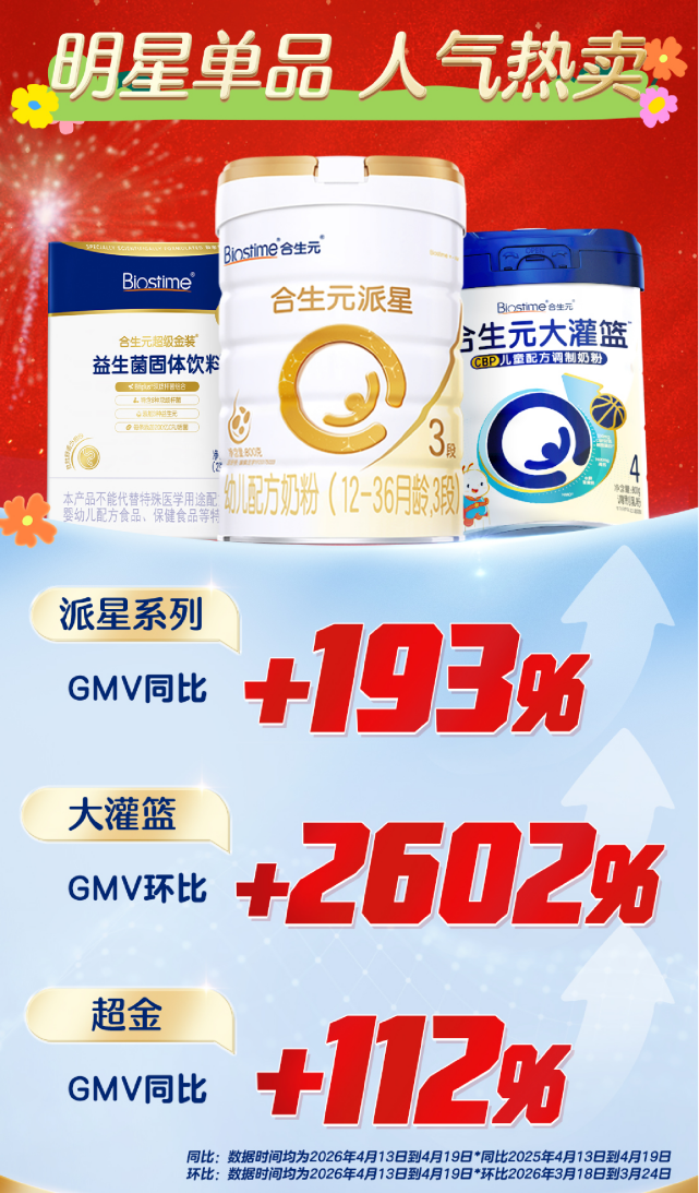 活动期间,合生元通过直播通关互动、福袋抽奖、赏春基金瓜分等趣味机制,搭配全链路引流设计,成功打通“品效销”转化闭环。4月13日-19日,合生元旗舰店GMV同比提升102%,其中,派星系列GMV同比提升193%,大灌篮GMV环比提升2602%,超金菌GMV同比提升112%,真正实现从流量曝光到销量转化的高效落地。