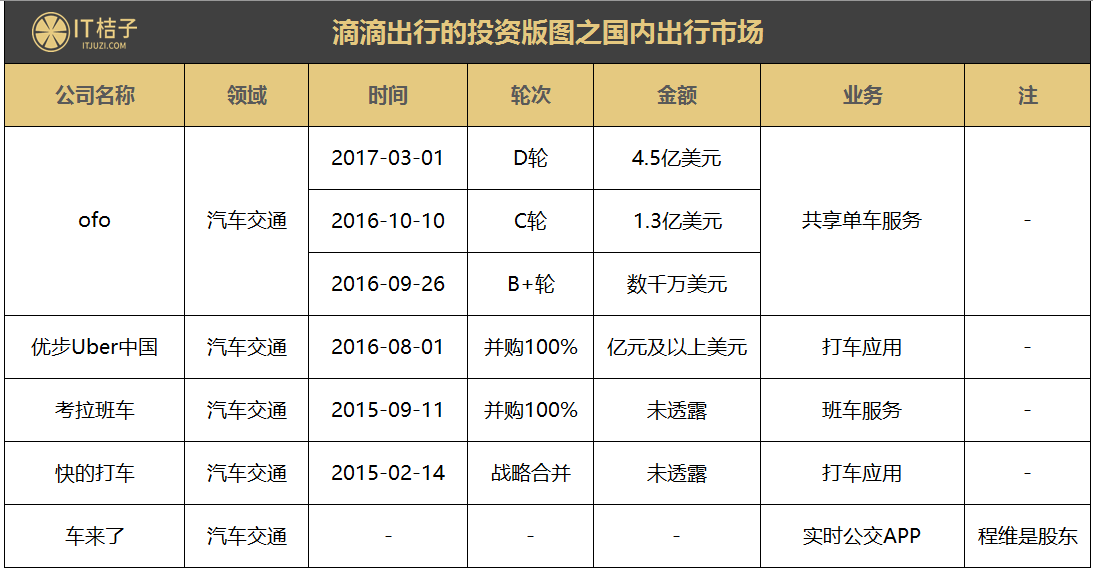 在投资并购方面,出行市场依然是滴滴整个业务版图的重中之重。