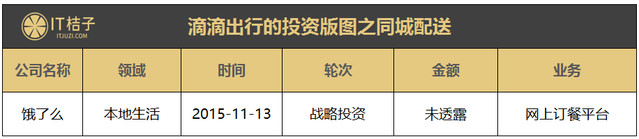 2015 年 11 月,滴滴出行战略投资饿了么,宣布将与饿了么就配送业务进行全面合作,合力搭建「两个轮子的电动车加四个轮子的汽车」的「2+4」同城配送体系。双方都试图在彼此所在的领域有所突破,并计划将合作扩展到快递、商超、生鲜等领域。