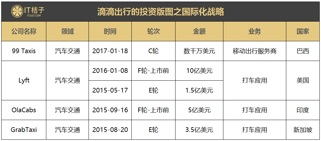另外,滴滴出行还投资了东南亚地区的领先出行平台 GrabTaxi,印度规模最大的移动出行平台 OlaCabs,以及巴西最大的本地移动出行服务商 99 Taxis。