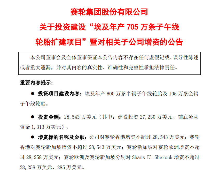 值得注意的是,此次扩建是在埃及基地现有项目基础上的追加投资。2025年8月,赛轮轮胎已宣布在埃及投资建设年产360万条子午线轮胎项目(300万条半钢胎+60万条全钢胎),投资总额2.91亿美元。