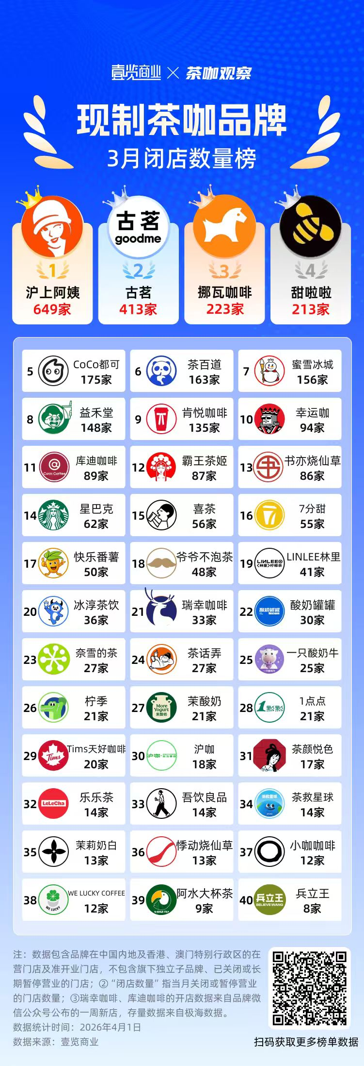 从关闭门店看,沪上阿姨闭店数量排在首位,为649家;古茗闭店数量位列第二,为413家;闭店数量在100家以上的品牌还有挪瓦咖啡、甜啦啦、CoCo都可、茶百道、蜜雪冰城、益禾堂、肯悦咖啡。
