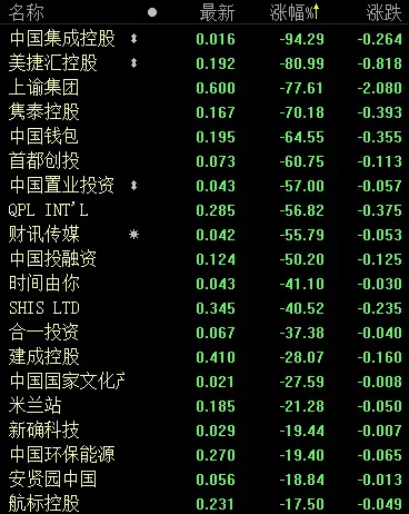 27日,始于10时30分出现暴跌且收盘跌幅超过15%的22只个股中,大部分都是原本股价小于1港元的“仙股”。以27日收盘跌幅最大的中国集成控股为例,该股27日以0.241港元的价格开盘,盘中一度跌无可跌,达至0.01港元,此外,创业板股票占了相当一部分比例。