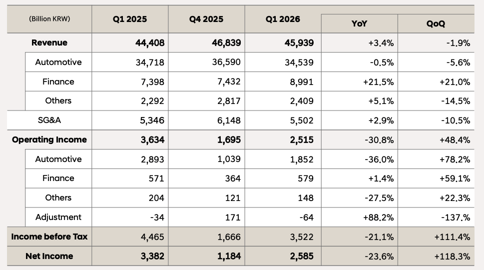 4月23日,现代汽车公司发布2026年第一季度财报:营收为45.94万亿韩元,同比增长3.4%;营业利润为2.52万亿韩元,同比下降30.8%;净利润为2.59万亿韩元,同比下降23.6%。
