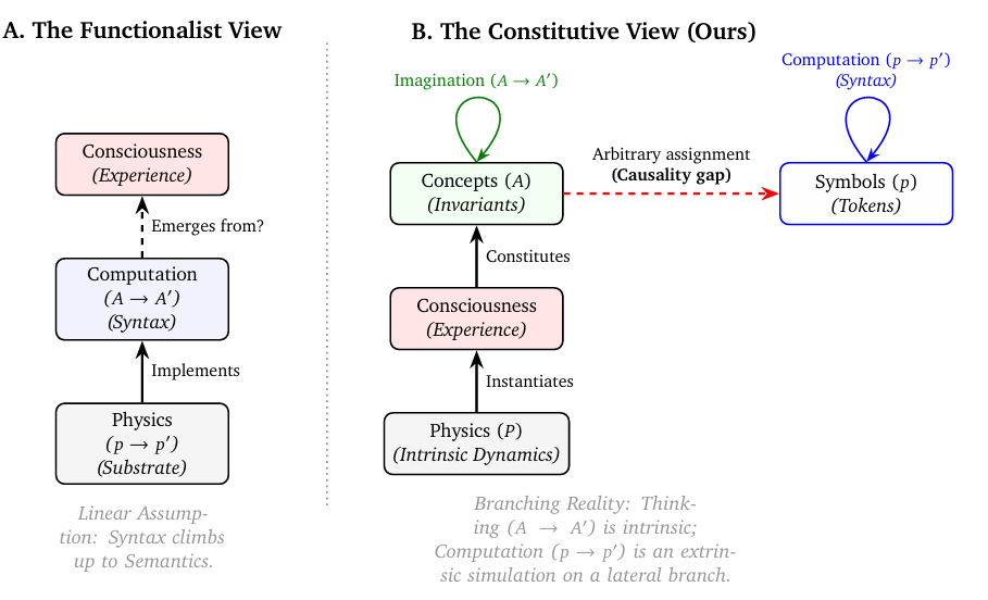 水平轴代表外在链条:符号 (p) 是通过将物理标记与概念任意关联而创建的(红色虚线箭头)。这种不可跨越的横向跨步构成了因果鸿沟。计算 ((𝑝 → 𝑝′) 是一个仅在此横向分支上运行的过程。这种从概念到符号的横向移动——一种任意分配而非垂直抽象——切断了任何从符号返回原始体验的内在因果路径。