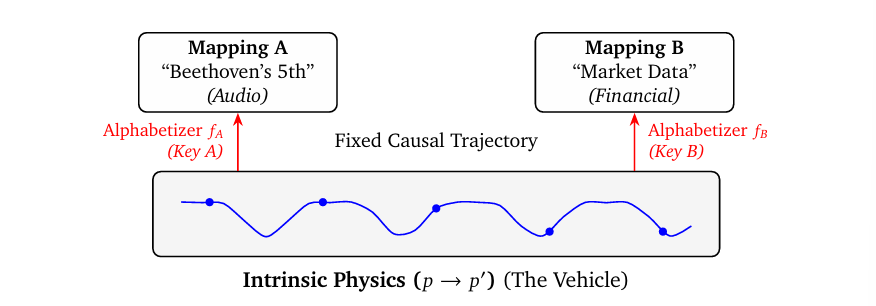 然而,这一精确过程的计算身份 (𝐴 → 𝐴′) 仍然完全是未充分决定的。如果没有外部制图者提供映射密钥,那组单一的物理状态序列可能代表: