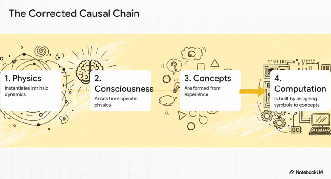 这条修正后的链条严格单向运行。虽然概念在物理上仍然锚定在主体的内在体验中——即不可还原的“它是什么样的”实体体验,但计算符号只是物理标记,与它们所代表的概念没有内在联系。从概念转移到符号不是抽象的一步。