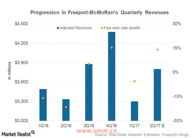 自由港预计在2017年第二季度的收入将达到38亿美元,而第一季度为33亿美元。 公司调整后EBITDA(利息、税收、折旧和摊销前盈利)预计在第二季度将上升至13亿美元,而第一季度仅为10亿美元。