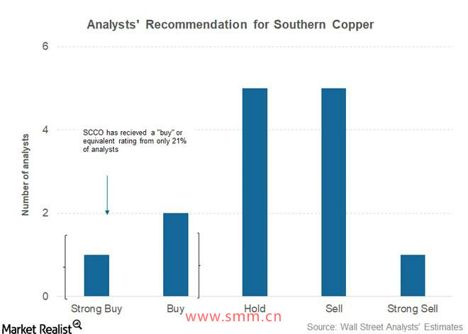 从路透社调查的13位分析师中只有3人对南方铜业给出 “买入”或等值评级。 五名分析师给予南方铜业“持有”评级,剩下的六位分析师则给予 “卖出”或等值评级。 南方铜业的评级占比例最高的是“卖出”建议。