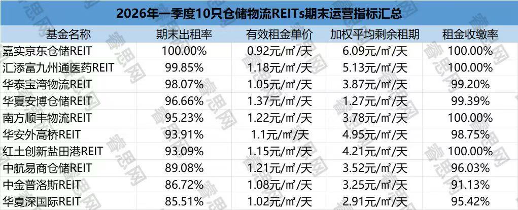 数据来源及免责说明:1、全国仓储市场数据:物联云仓《2026 年 3 月全国通用仓储市场动态报告》;2、REITs 财务与运营数据:各公募 REITs 2026 年第一季度报告;3、出租率、租金、收缴率、剩余租期均为报告期末整体口径;4、本文仅为行业分析,不构成任何投资建议,市场有风险,投资需谨慎。
