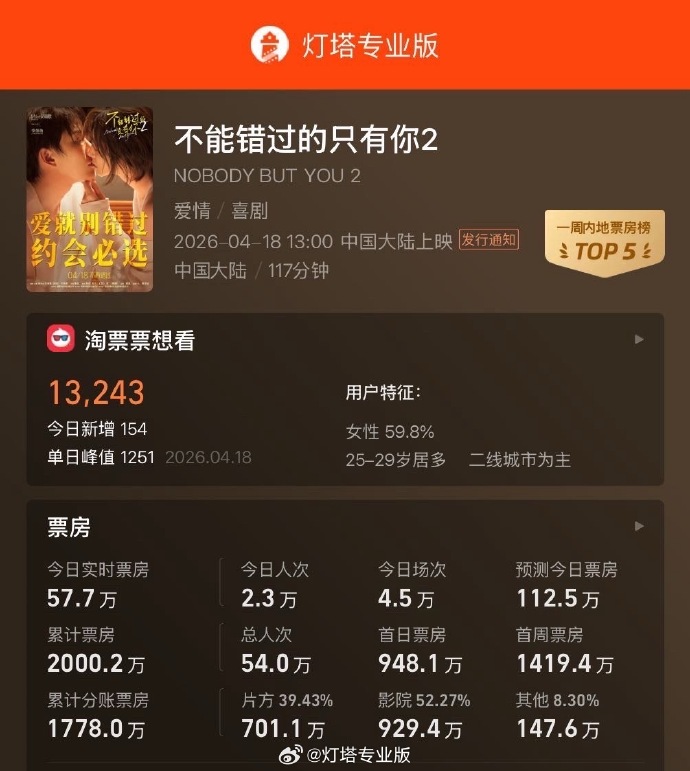 据灯塔专业版实时数据,截至4月23日20时18分,影片《不能错过的只有你2》票房突破2000万。