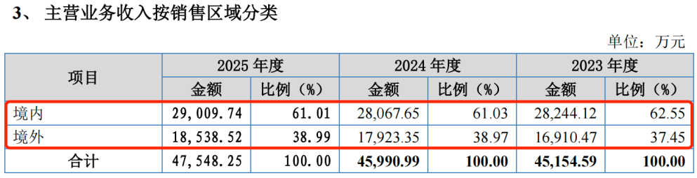 报告期内,公司境内收入占主营业务收入比例约六成,境外收入占比约四成。