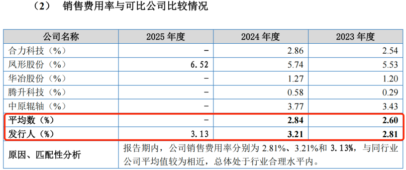 2023年和2024年,同行可比公司的销售费用率平均值分别为2.60%和2.84%,均低于同期凯达重工的销售费用率水平。