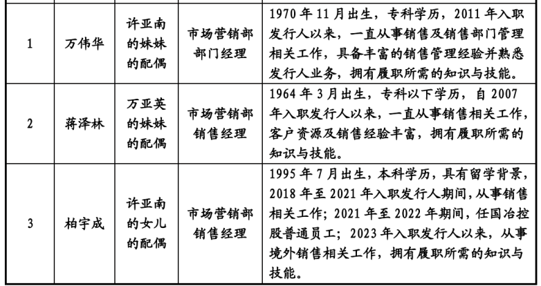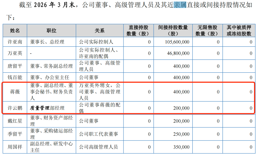 除此之外,许亚南妹夫万伟华在公司任市场营销部部门经理;万亚英妹夫蒋泽林、许亚南女婿柏宇成均在市场营销部任销售经理。