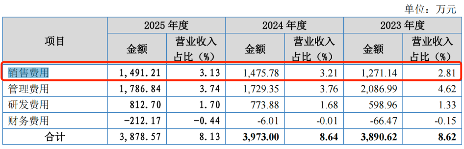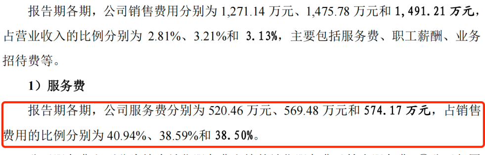 招股书显示,报告期内,公司的销售费用分别为1271.14万元、1475.78万元和1491.21万元,占营业收入的比例分别为2.81%、3.21%和3.13%。据了解,其销售费用主要包括服务费、职工薪酬、业务招待费等项目。