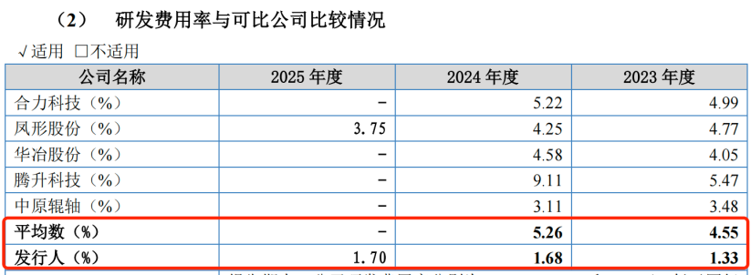 2023年和2024年,同行可比公司的研发费用率均值分别为4.55%和5.26%,远高于同期凯达重工的研发费用率水平。对此,公司在招股书中解释,公司采用研产一体化模式,研发投入结构贴合自身经营现状。