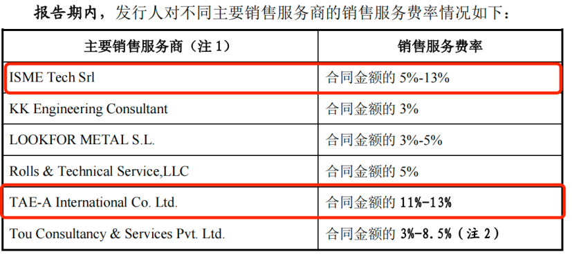值得注意的是,公司对主要境外服务商颇为“优待”,给予部分服务商的销售服务费率最高达合同金额的13%。