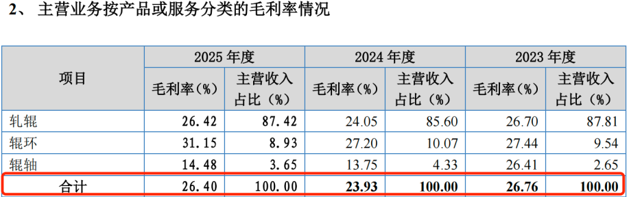 与此同时,辊轴的毛利率由2023年的26.41%下滑至2025年的14.48%,2年累计下滑了11.93个百分点。