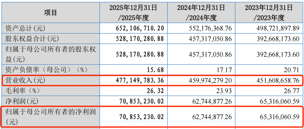 招股书显示,2023年至2025年(以下简称“报告期”),凯达重工的营业收入分别为4.52亿元、4.60亿元和4.77亿元;归母净利润分别为6531.61万元、6274.49万元和7085.32万元。其中,2024年的归母净利润有所下滑。