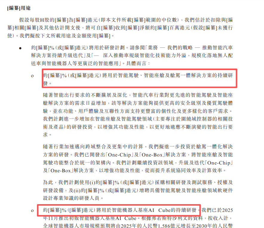 根据其招股书表示,本次H股发行旨在“推进国际化战略布局、提升国际影响力、加快海外业务拓展”,募资将用于智能驾驶、智能座舱、舱驾一体解决方案、机器人AI Cube的持续研发,以及产能扩充。