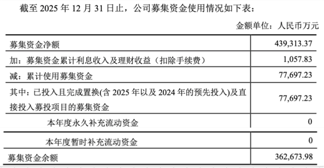 截至2025年末,43.93亿元的定增资金仅实际使用7.77亿元,占比不足18%,剩余36.27亿元资金尚未使用。