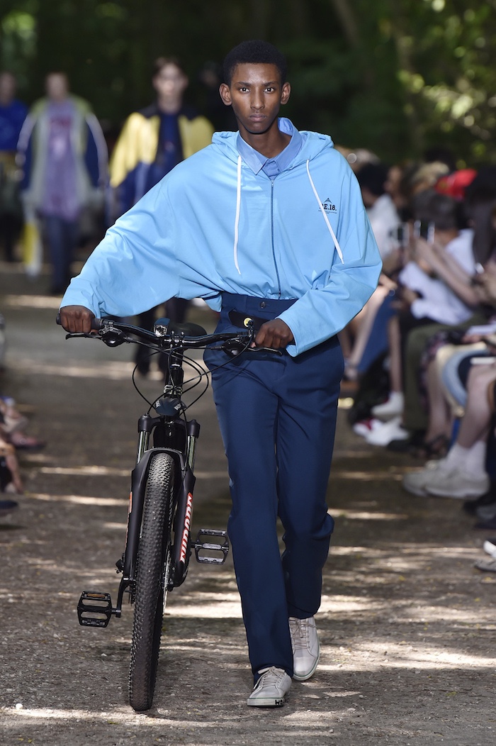 实际上,这款自行车在品牌2018春夏男装系列发布会上已有展示。如果看到模特推着车,穿着复古味浓重的休闲搭配一一从树林深处走来,很容易能感觉到品牌这一季”周末家庭游玩“的灵感来源。