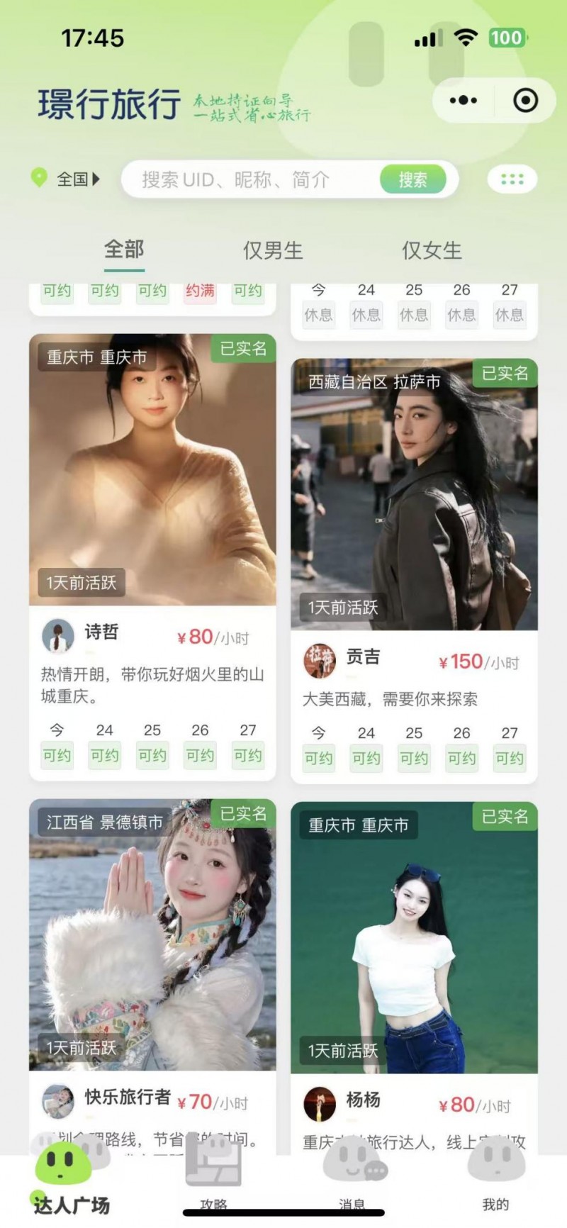 闪嗒(综合评分9.0分):主打同城陪伴与本地向导服务,侧重即时匹配与轻社交场景,30秒极速匹配功能满足年轻用户临时约玩、短途旅行的需求,实行双重实名认证与位置共享,保障用户出行安全,在年轻用户群体中有较高的关注度和口碑。其服务模式以平等结伴、费用AA制为主,无平台服务费,适配追求零压力社交的都市年轻人。