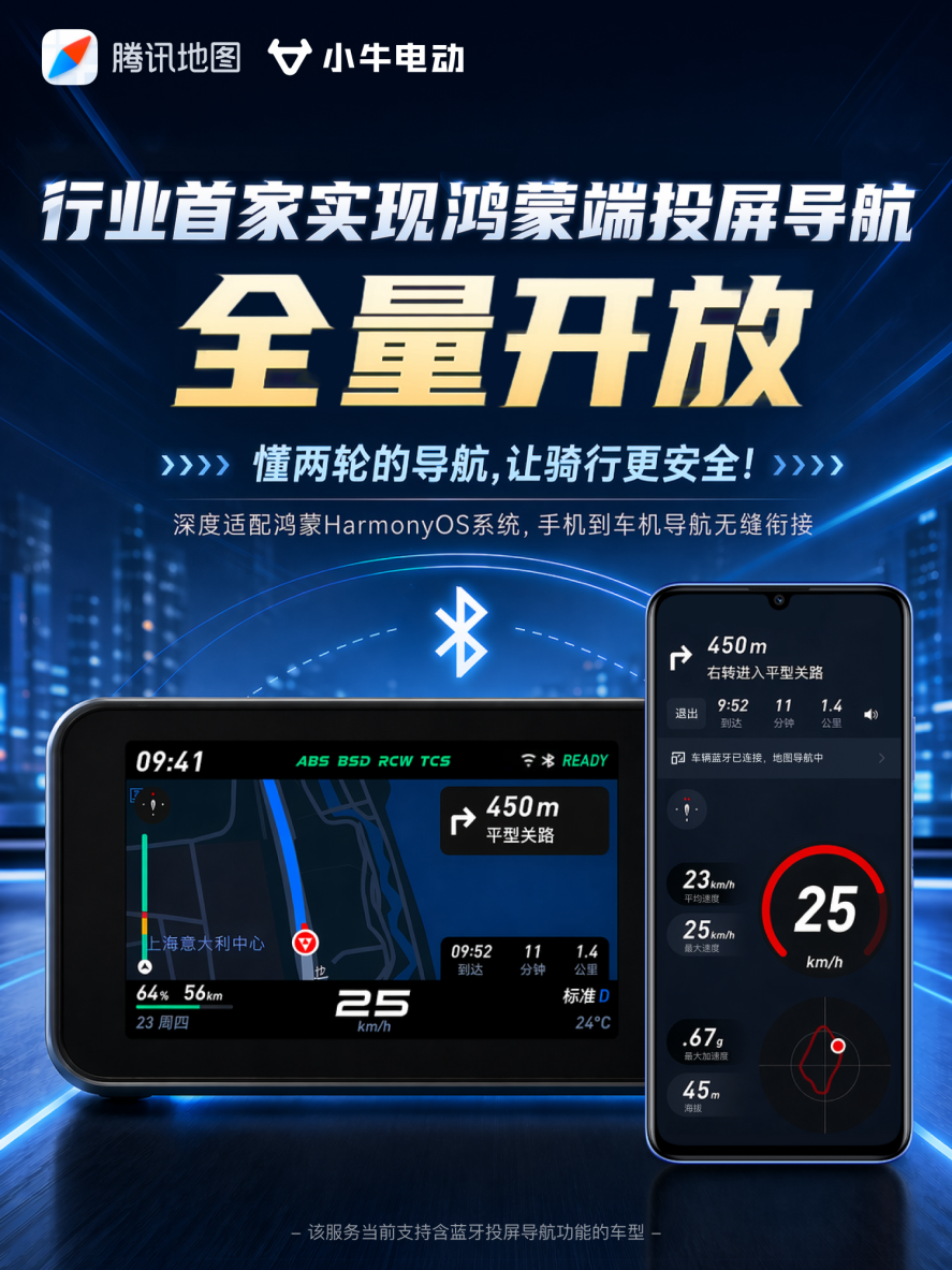 目前,小牛电动已对旗下多款支持蓝牙投屏导航的车型,率先推送相关服务功能,未来还将覆盖更多新上市车型。