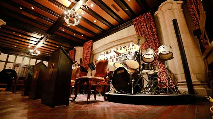 在和平饭店北楼底层大堂的东北角的一个厅堂,黑色粗壮的房梁,几米长的吧台,四十张沙逊八角桌,老式烛灯柔和的光晕,红钢砖地板、木质房柱,营造出英式乡村酒吧的氛围。这里,在1929年的华懋饭店是名为“马和猎犬”的爵士酒吧,1980年老年爵士乐队成立,这里也被改称“爵士酒吧”。