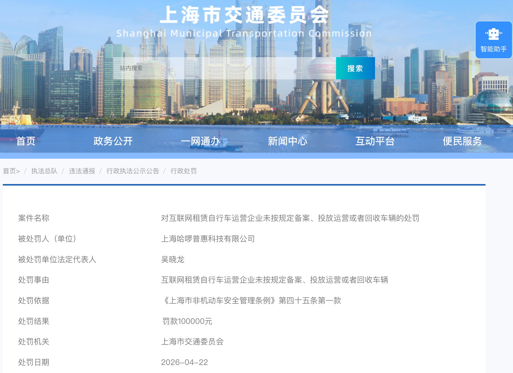 4月24日消息,据上海市交通委网站,上海哈啰普惠科技有限公司(下称哈啰)因“互联网租赁自行车运营企业未按规定备案、投放运营或者回收车辆”被上海市交通委员会罚款10万元,处罚日期显示为4月22日。今年1月,哈啰因相同事由被罚款10万元。