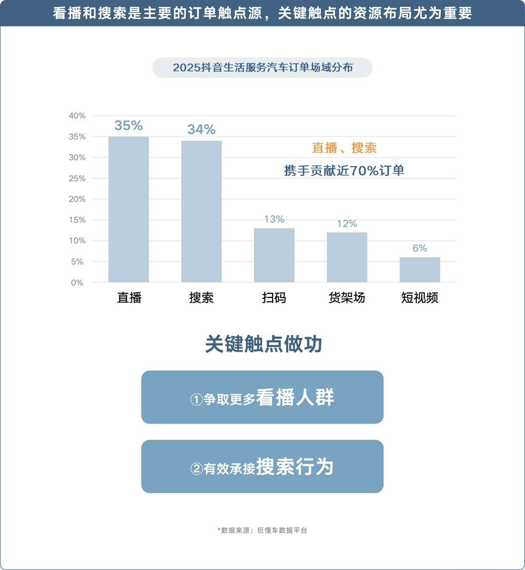 从成交来源看,直播和搜索正在成为影响买车决策的重要入口。根据白皮书对2025年抖音生活服务订单的统计,约35%的汽车订单来自直播,34%来自站内搜索,13%来自线下扫码,12%来自货架场景,6%来自短视频内容。也就是说,直播帮助用户更直观地了解产品,搜索则帮助用户快速找到目标信息,两者一起推动了转化。