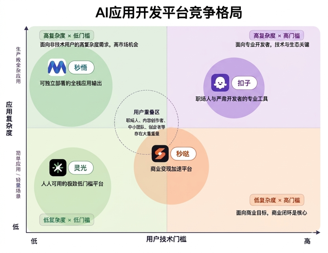 以“技术门槛”和“应用复杂度”两个维度搭建行业竞争地图,四款产品的站位差异一目了然:灵光以极致低门槛覆盖最广泛的大众用户,居于地图左下角;秒悟输出的是可独立部署的全栈应用,居于左上角;扣子聚焦职场人群与严肃开发者,门槛与复杂度双高,处于右上位置;秒哒位置相对居中,更偏向商业变现纵轴。