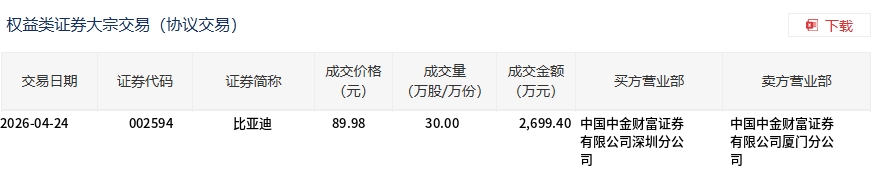 4月24日,比亚迪大宗交易成交30万股,成交额2699.4万元,占当日总成交额的0.8%,成交价89.98元,较市场收盘价99.46元折价9.53%。