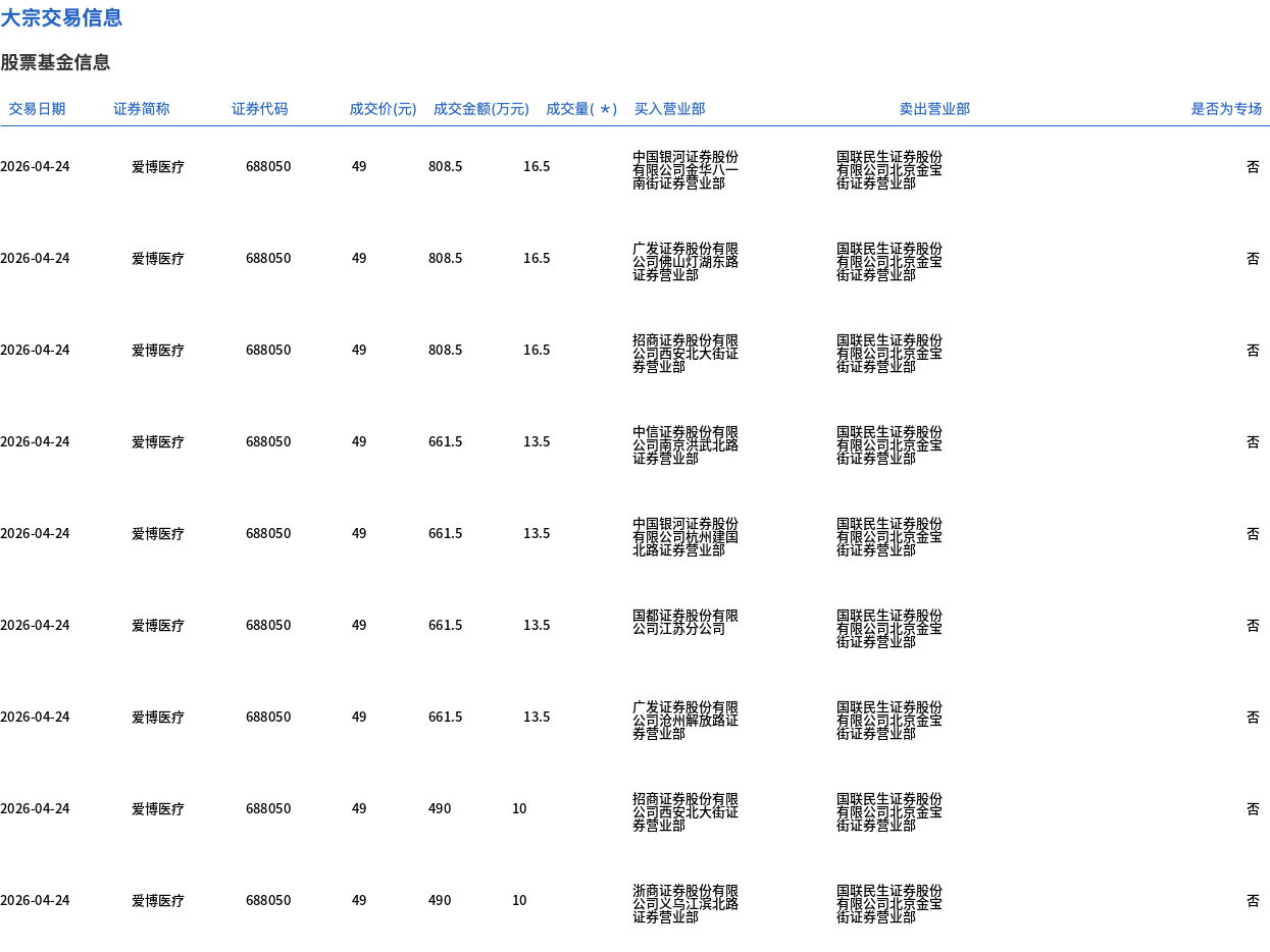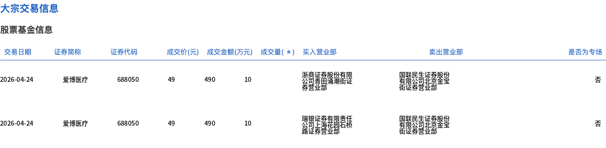 4月24日,爱博医疗大宗交易成交143.5万股,成交额7031.5万元,占当日总成交额的32.56%,成交价49元,较市场收盘价53.12元折价7.76%。