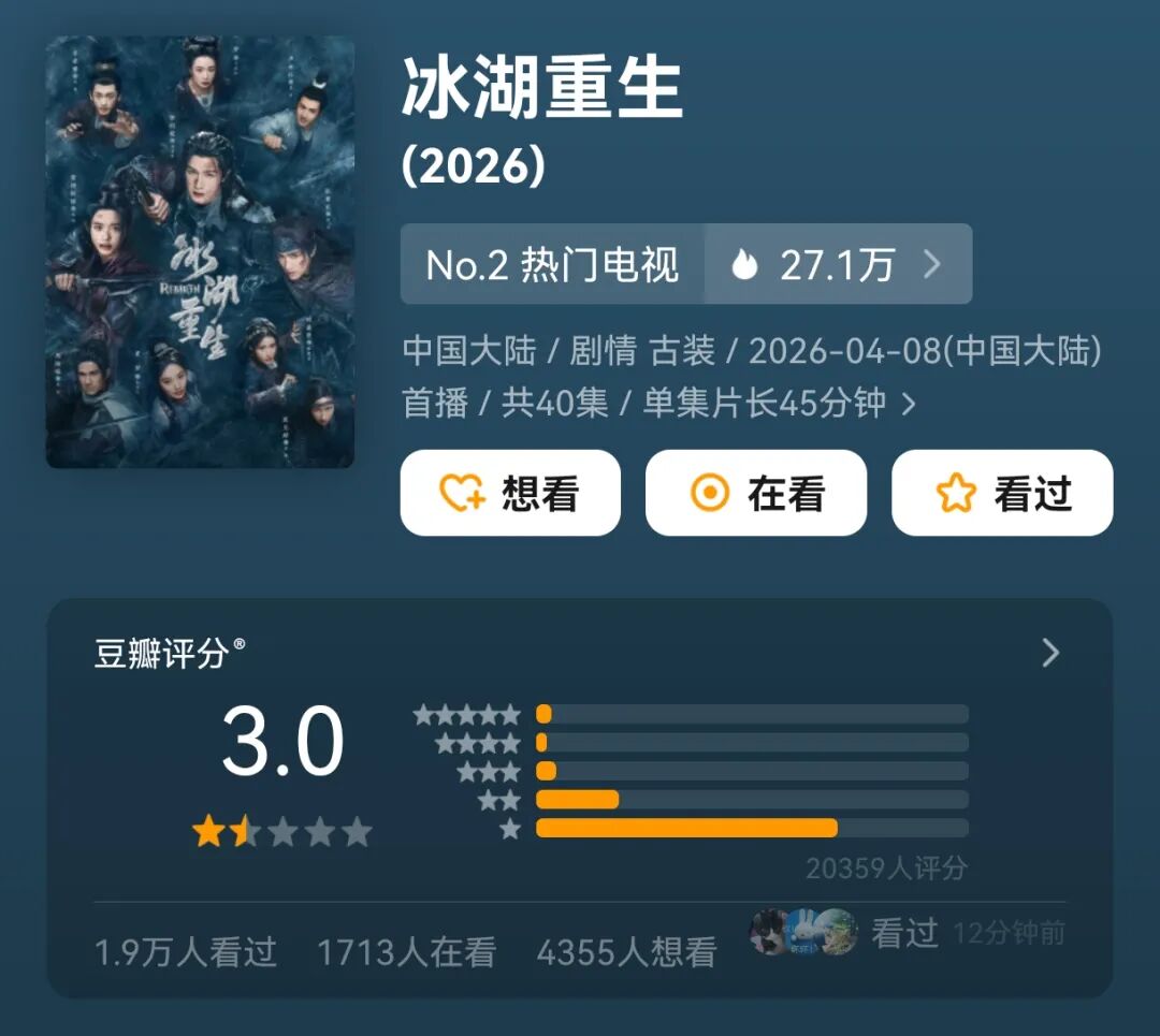 3.0评分与暂时集均200多万的战绩,显然刺痛了公司老板、剧集主创、投资方的心。
