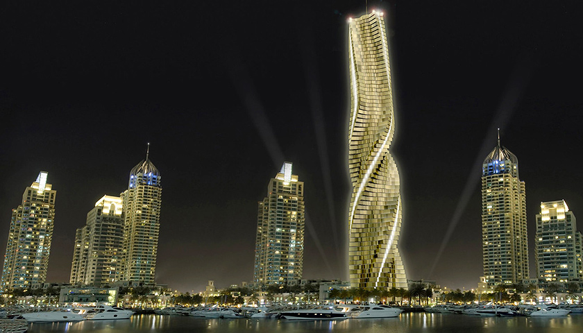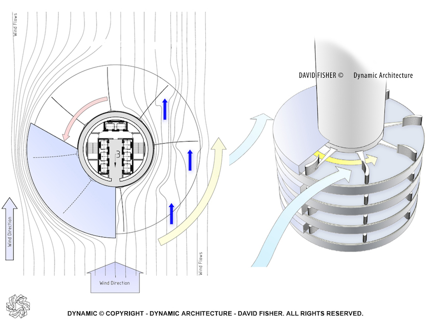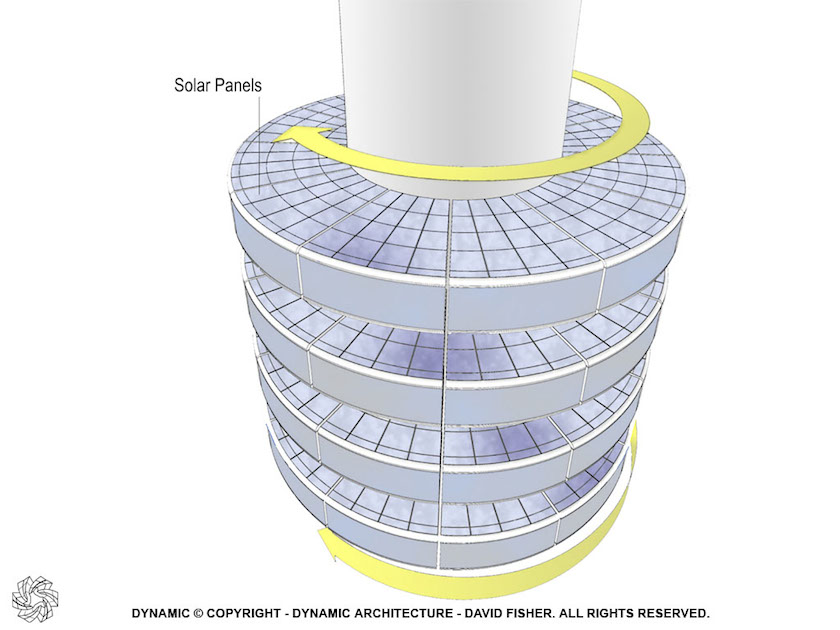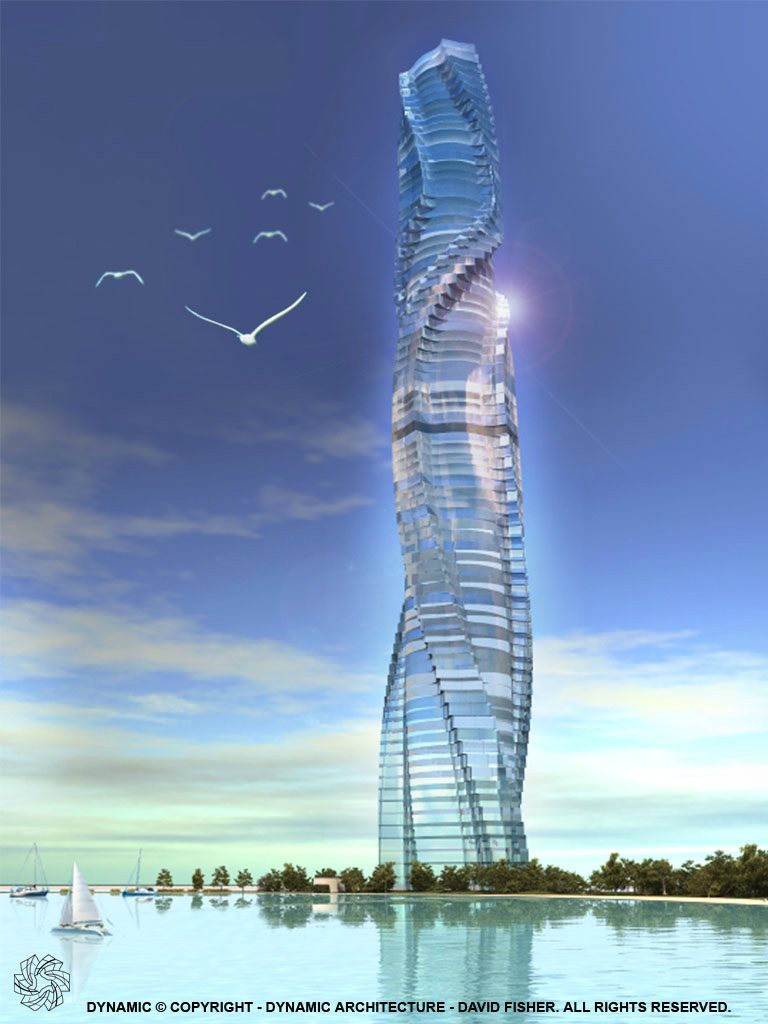 这栋名为Dynamic Tower的4D建筑,高约420米,包含办公、住宿以及酒店等功能。该建筑最与众不同的地方在于其每个楼层都能独立旋转。除了楼层的旋转,从外部看,大楼自身也在不断旋转。