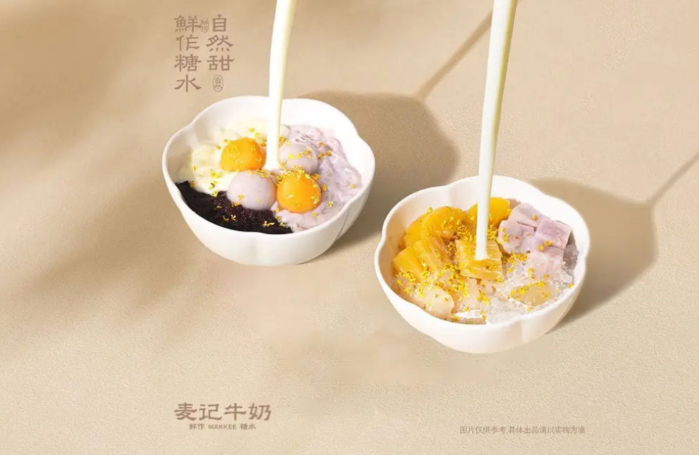 新品牌则走得更远。麦记的产品结构以糖水为主,辅以鲜乳茶、柠檬茶、糯米酸奶等,模糊了糖水和茶饮的边界。消费者可以“边走边喝”,不必像传统糖水店那样必须坐下来慢慢吃。