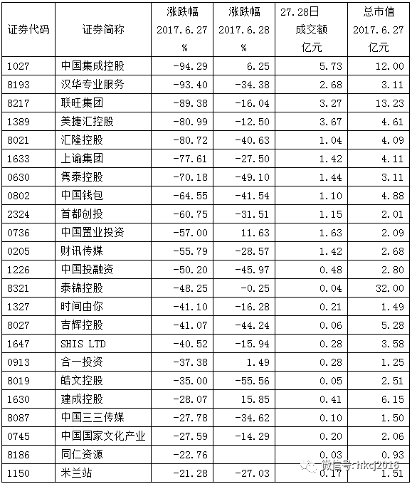 6月28日,部分“老千股”跌势继续扩大,其中皓文控股跌逾50%,吉辉控股、中国投融资、隽泰控股、中国钱包等跌逾40%,汉华专业服务、中国三三传媒、首都创投等跌逾30%,大有一去不复返之势啊。