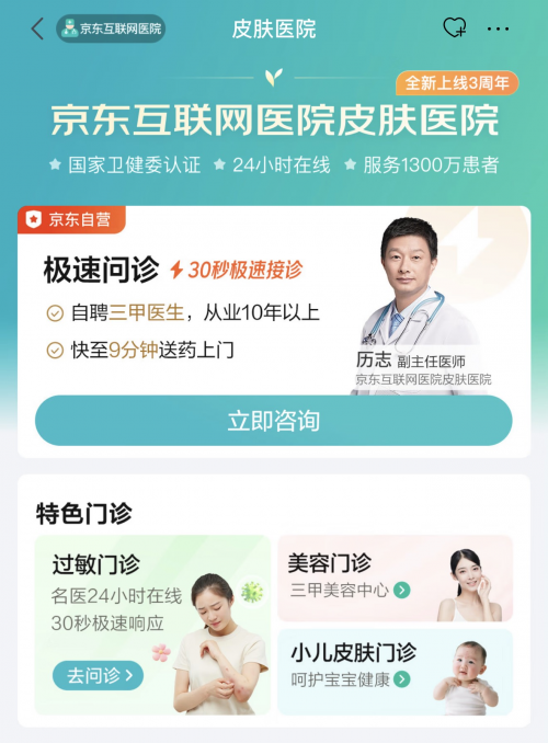 三年前,京东互联网医院皮肤医院从痤疮、皮炎湿疹、过敏、脱发等常见病起步。如今,其服务边界已拓展至过敏、毛发、美容护肤、小儿皮肤等特色门诊,形成了覆盖常见病与专病、急性问题与慢病管理的服务矩阵。