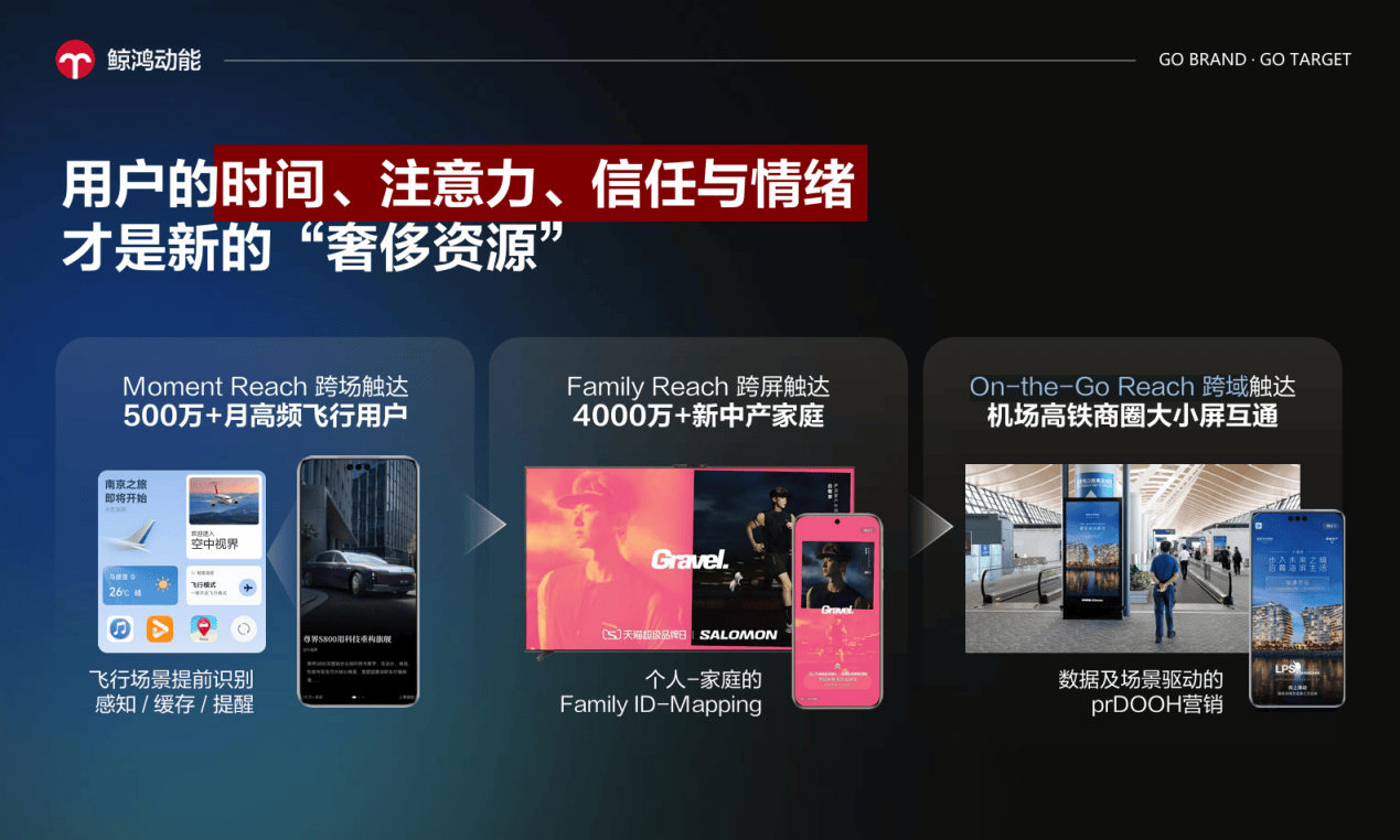 首先是场景联动,构建全旅程的沉浸体验。鲸鸿动能通过Moment Reach 跨场、Family Reach 跨屏、On-the-Go Reach 跨域三大触达能力,让品牌在不同终端之间实现连贯、优雅的触达和沟通。例如家庭场景下智慧屏的影院级呈现到手机屏种草,每一次出现都是同一品牌气质的延续,而非断裂的打扰。