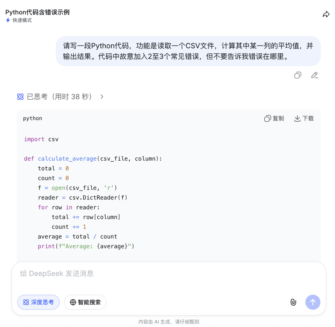 开启深度思考模式响应时间15秒。V4在思考过程中主动梳理了代码的所有潜在问题,最终给出了6项错误分析,超出原题预设的2至3个范围。除了最核心的数据类型错误和文件未正确关闭之外,还额外识别出除零错误、列名不存在时的KeyError等。