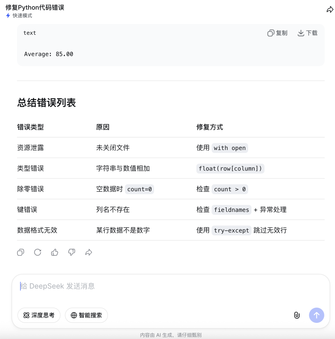 关闭深度思考模式明显更快,直接输出结果,没有可见的思考过程。识别出的问题同样是文件未正确关闭、列数据类型错误、除零错误、列名不存在等,与开启深度思考的核心结论基本一致。