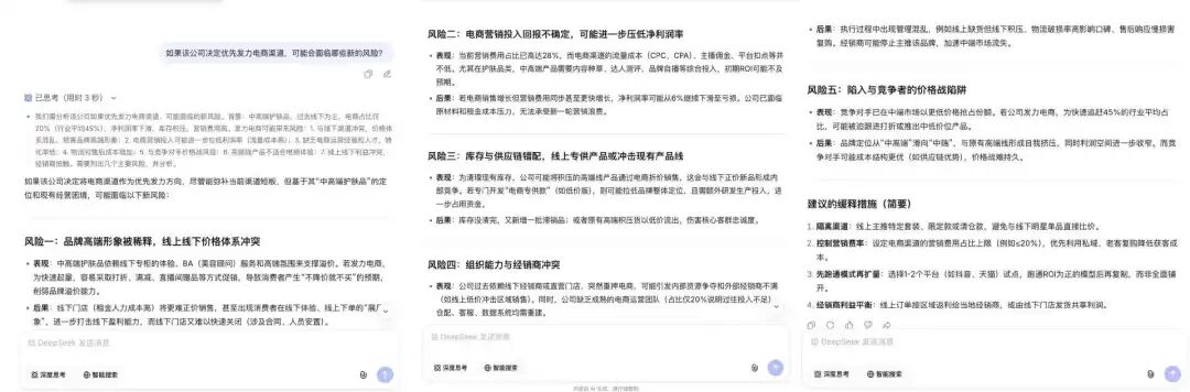 为了验证连续推理能力,我们追问发力电商渠道的风险,响应用时仅3秒,直接在第一轮建立的背景基础上继续推导,V4识别出五项新风险。