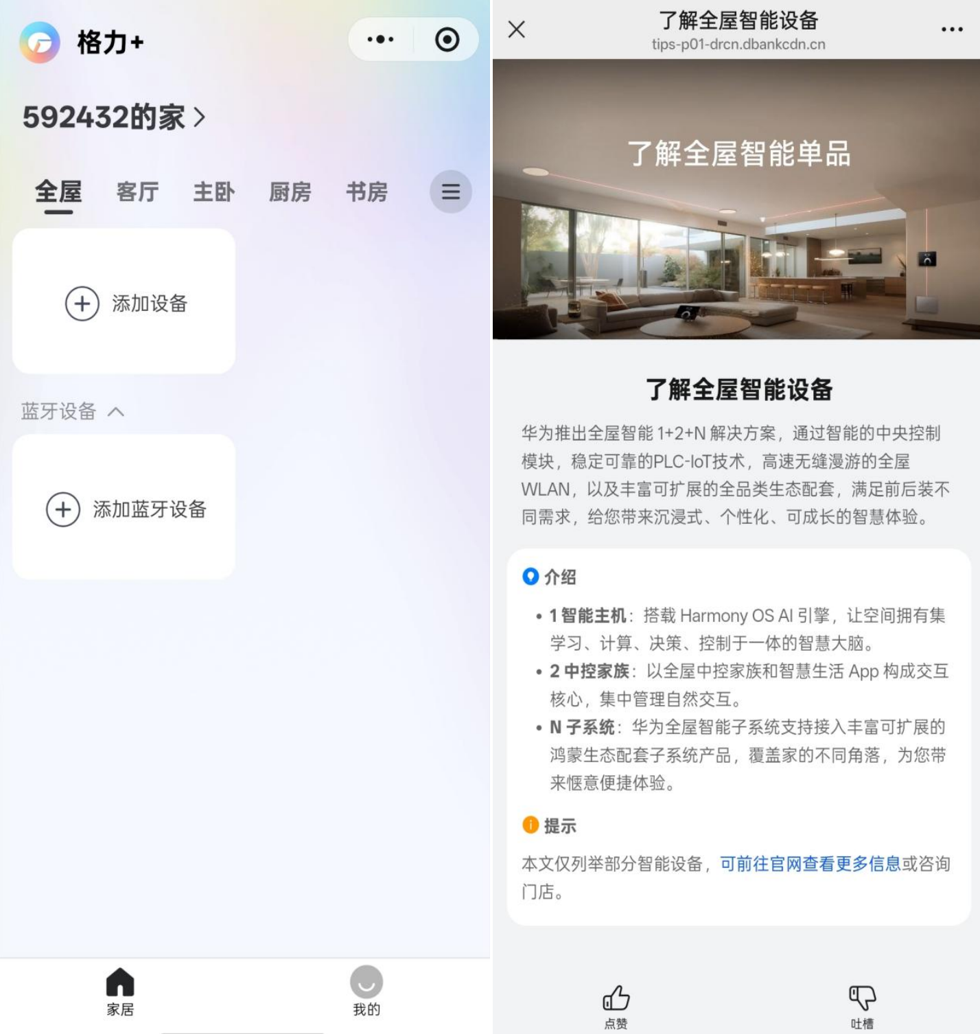 对此陆玖商业评论从小程序上,简单体验了下不同代表厂家的全屋智能操作界面。整体下来格力、美的的操作相对简单,格力可以对客厅、主卧等不同地方进行设备添加感知。而华为则构建了主机+中控+多个子系统的生态,同时支持车家互联功能。美的与格力类似,整体页面比较简洁,连接层面可以选择诸多设备产品。